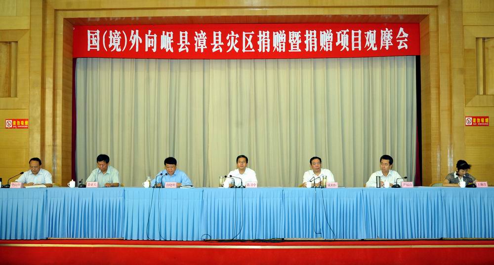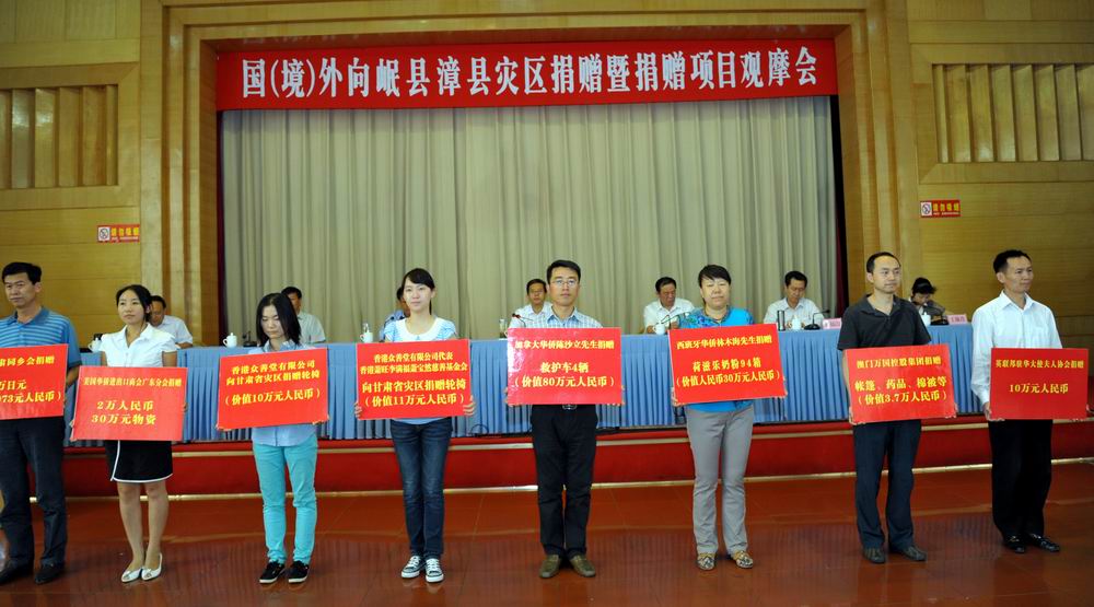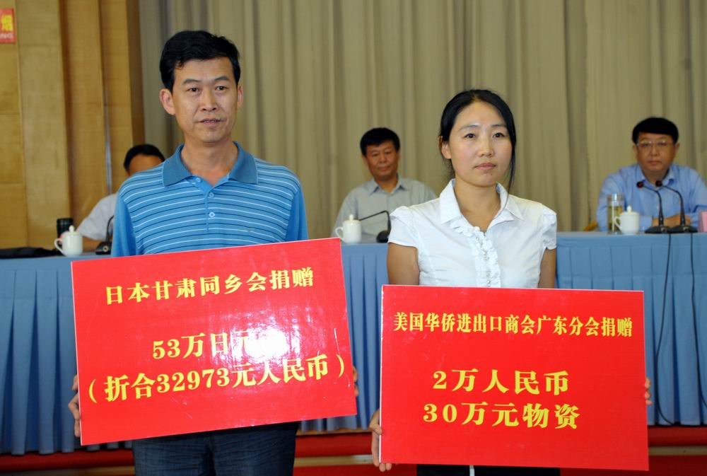 8月9日上午,省政府外事侨务办公室在定西市举行向岷县、漳县灾区捐赠暨捐赠项目观摩会,向岷县、漳县地震灾区转交国际友好城市和人士、海外华人华侨、港澳同胞捐赠款物共计价值200万元。其中,通过省侨联向灾区捐赠款物的有:日本甘肃同乡会捐赠53万日元,折合3.3万元人民币;美国华侨进出口商会广东分会捐赠2万元人民币和价值30万元人民币的物资。