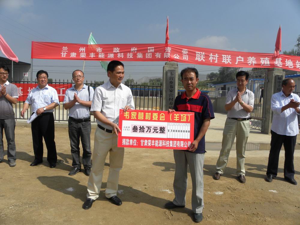 中国侨商会常务副会长、甘肃省人大代表、甘肃省侨商会会长、甘肃荣丰能源科技集团董事长颜芝先生向养殖产业基地捐赠30万元,为韦家营村每户村民购买2只小尾寒羊,他表示:作为在甘发展的企业家,甘肃为我们企业的发展提供了广阔的舞台,回馈社会、扶贫济困是我们责无旁贷、义不容辞的责任,本人的捐赠虽然难以立刻从根本上解决韦家营村乡亲们诸多的生活困难,但我希望能为实现甘肃与全国同步进入小康社会的目标尽自己的一份绵薄之力。