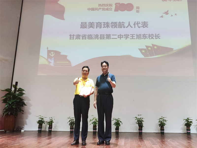 闫鹏勋为最美育珠领航人代表——甘肃省临洮县第二中学王旭东校长颁奖