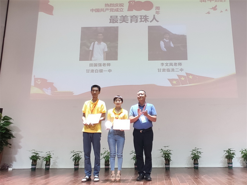 安亚军为最美育珠人——甘肃白银一中田国强老师和甘肃临洮二中李文凤老师颁奖