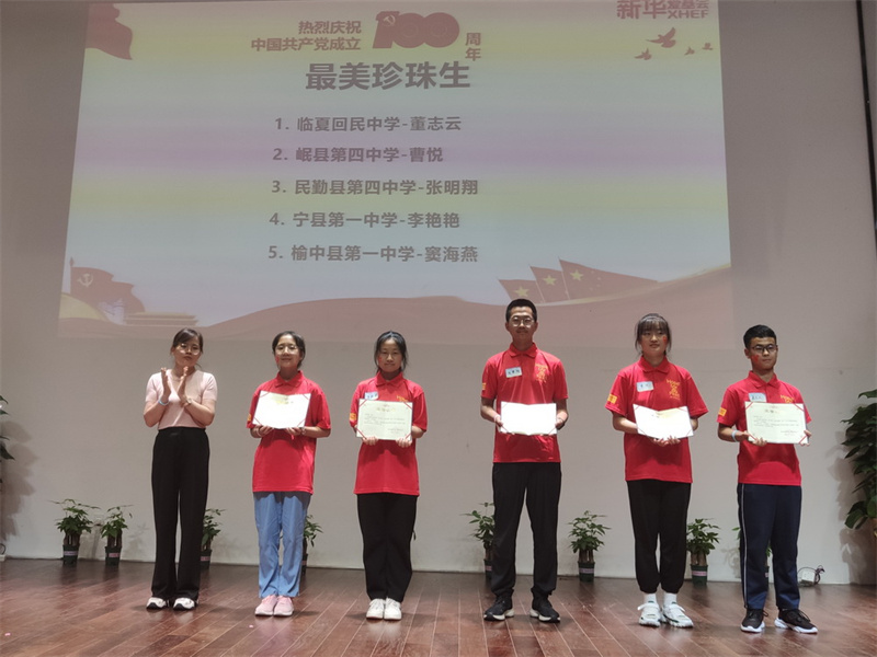 献礼建党百年晚会上,闫鹏勋作为嘉宾代表致辞,他表示,甘肃是全国接受“珍珠班”捐赠最多的省份,浙江省新华爱心教育基金会的同志们和志愿者数十年如一日在甘肃开展“捡回珍珠”计划, 努力打破贫困代际传递,做出了极大努力,付出了巨大心血,向基金会同志们的敬业精神和无私奉献表示衷心感谢。希望基金会继续关心和支持甘肃的教育事业,全省各级侨联组织将为基金会在甘肃开展“珍珠班”项目做好联系服务工作,共同培育支持“珍珠生”自信、阳光、健康地成长。