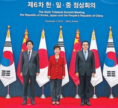 第六次中国、日本、韩国领导人会议当地时间11月1日下午在首尔举行。中国国务院总理李克强、韩国总统朴槿惠和日本首相安倍晋三出席会议。会议由朴槿惠主持。三国领导人对中日韩合作进行了回顾与展望,并就地区和国际问题交换看法。