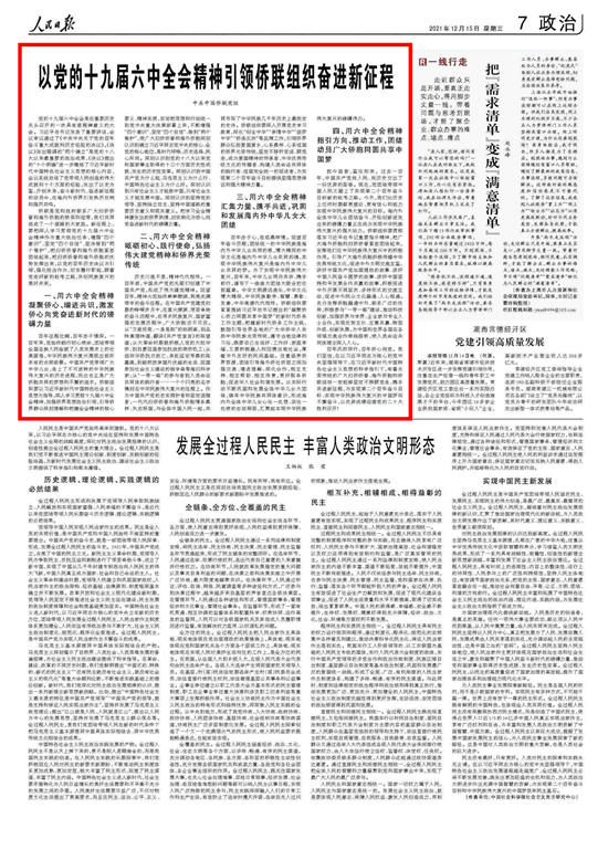 《人民日报》刊发中国侨联党组署名文章:以党的十九届六中全会精神引领侨联组织奋进新征程