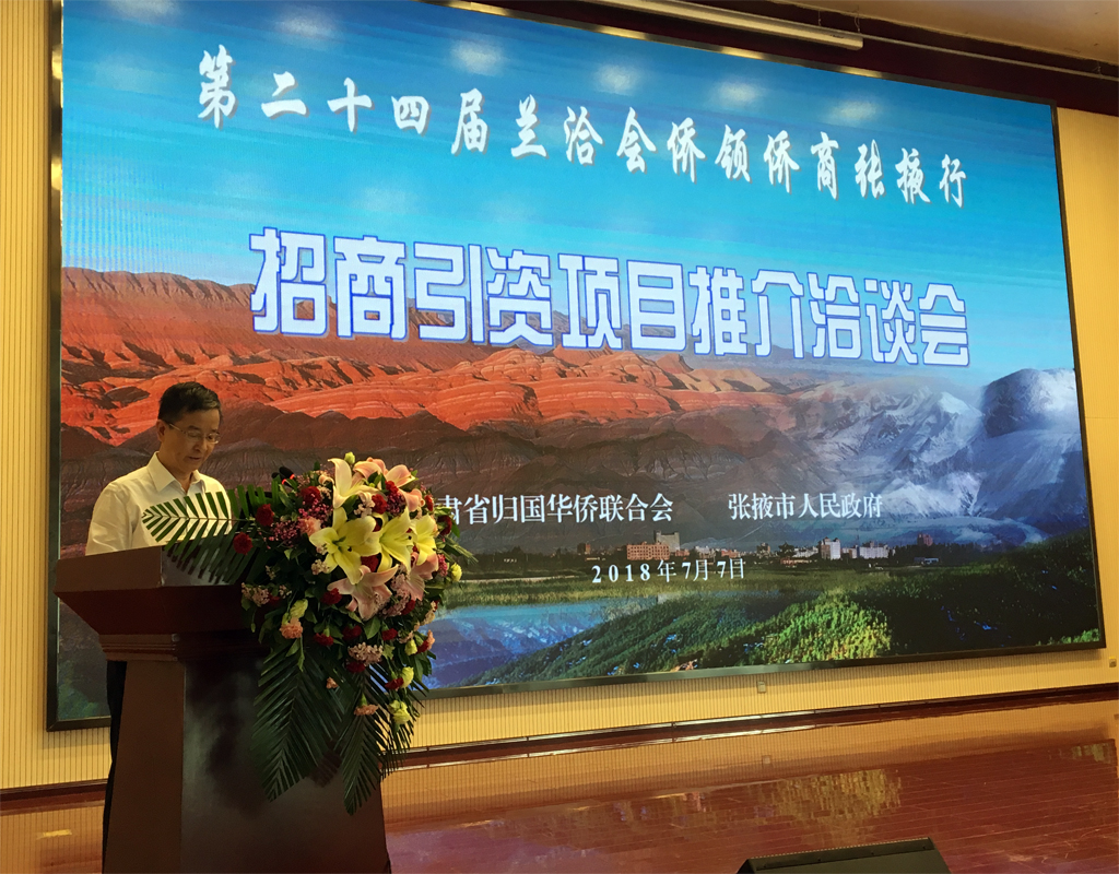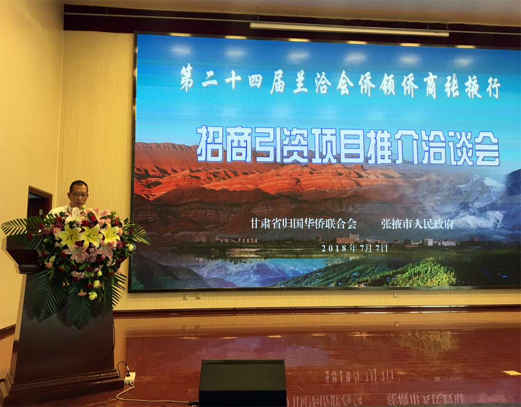 7月7日,“第二十四届兰洽会侨领侨商市州行—走进张掖”招商引资项目推介洽谈会在张掖宾馆举行。中国侨联经济科技部巡视员、中国侨商联合会副会长兼秘书长安晨,甘肃省侨联党组书记、主席丁红星分别致辞,张掖市委副书记、市长黄泽元作专题推介。张掖市委常委、市委统战部部长秦禾主持。来自秘鲁、加拿大、新西兰、吉尔吉斯斯坦及北京、广东等海外和有关省份侨领侨商代表共100多人参会。
