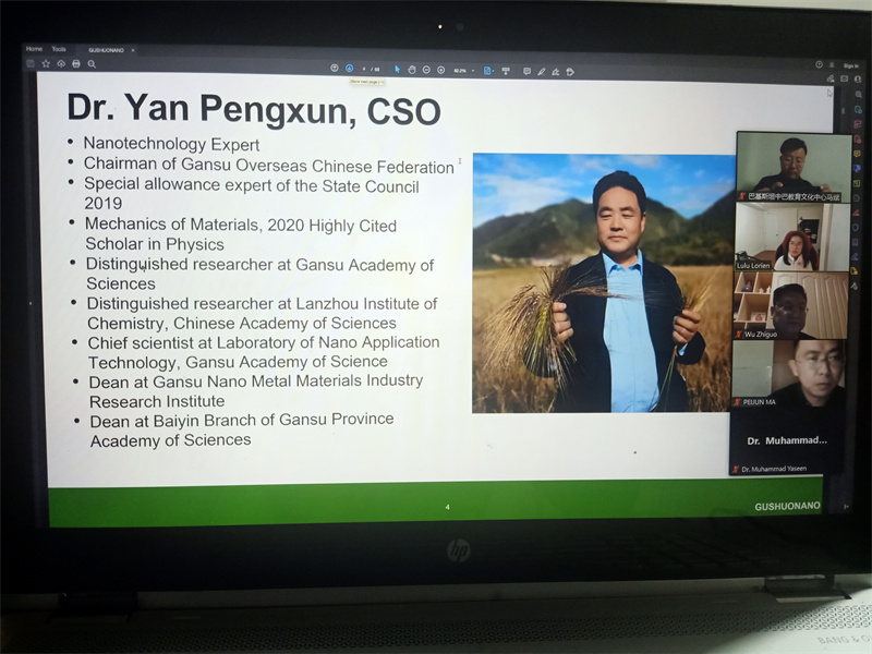 “Nanotechnology for high-efficacy agriculture will promote traditional agriculture on the road of high-quality connotative development. It can effectively promote farmers’ increase in production and income and solve problems such as abandoned farmland and the adverse effects caused by excessive use of pesticides and fertilizers. We tend to extend this achievement to our ‘iron brother’ Pakistan,” Dr. Wu Zhiguo, Director of Nano Application Technology Research Office of Gansu Academy of Sciences highlighted on a video meeting with Prof. Dr. Muhammad Yaseen from University of Faisalabad (UAF) on Wednesday. Mr. Ma. Yutian, Executive Director General of Gansu BRI Technology Transfer Center attended the meeting.