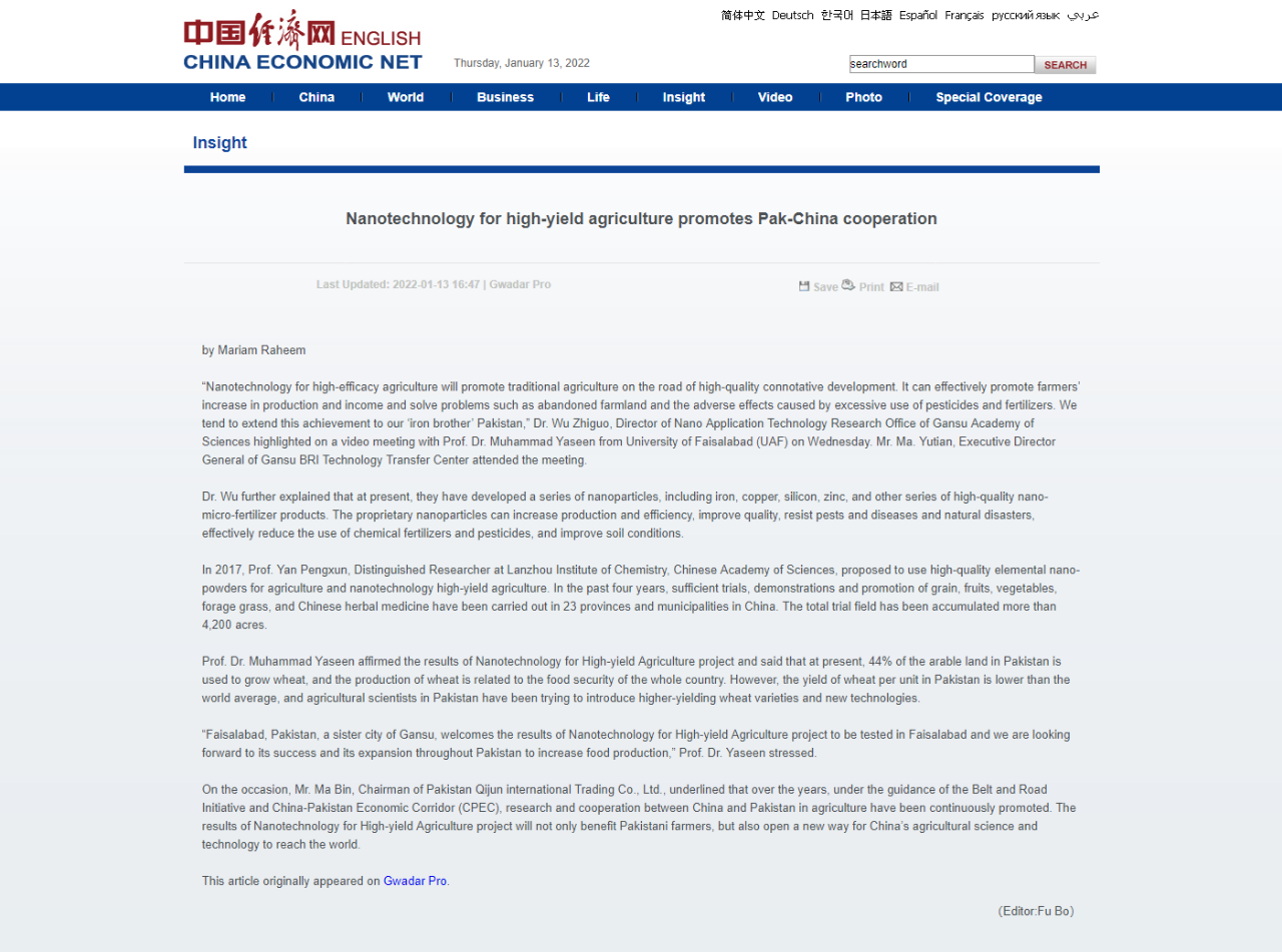 “Faisalabad, Pakistan, a sister city of Gansu, welcomes the results of Nanotechnology for High-yield Agriculture project to be tested in Faisalabad and we are looking forward to its success and its expansion throughout Pakistan to increase food production,” Prof. Dr. Yaseen stressed.