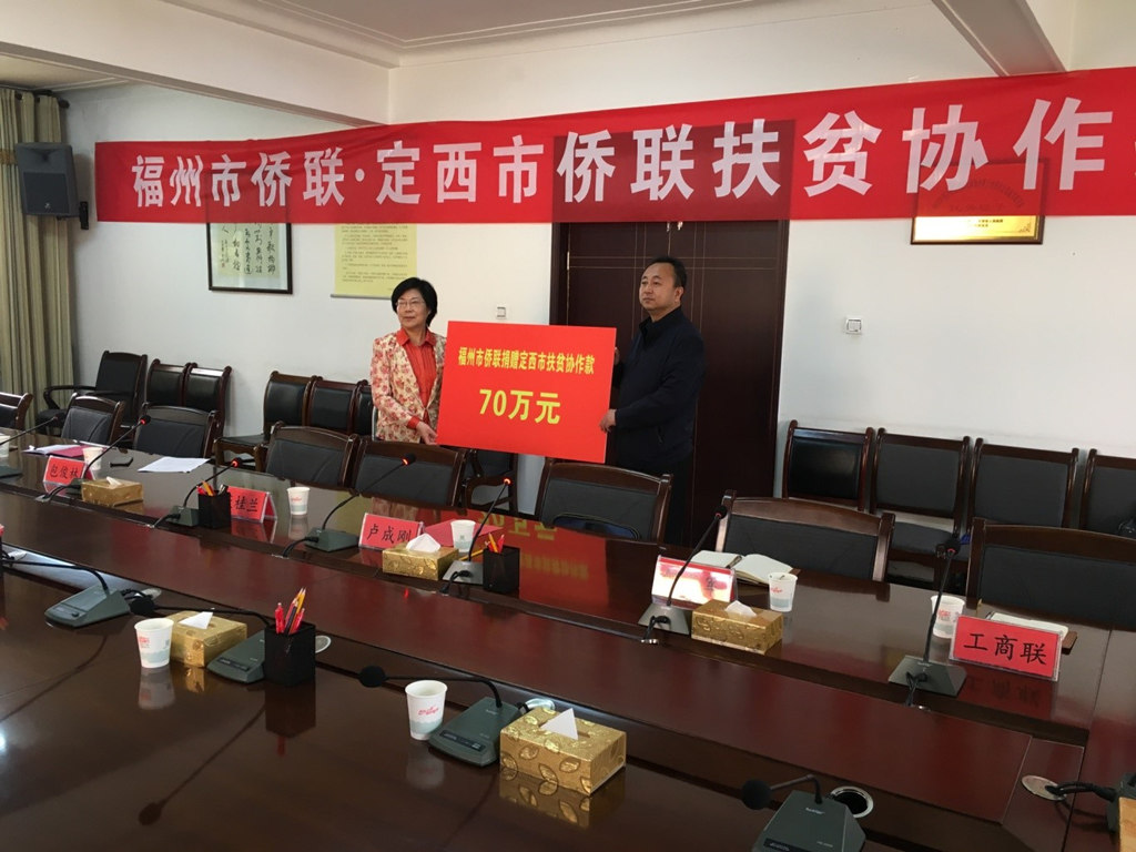 2017年来,为积极响应党中央东西部扶贫协作号召,福州市侨联与定西市侨联建立了友好协作单位,工作开展以来,福州市侨联发挥侨资源丰富的优势,动员福州各界力量,为定西捐款捐物,目前已累计为定西提供帮扶资金近百万元,助推定西打赢脱贫攻坚战。今年,福州市侨联又多方奔走,为定西带来帮扶资金70万元,资金来源于福州市侨界的捐助,其中福州市侨联援助15万元、福州侨商会援助20万元、福州平潭中诺发展有限公司援助 14万元、福建永荣基金会援助15万元、福州许枫卿女士个人捐助6万元。这些资金犹如雪中送炭,助力我市打赢脱贫攻坚战成效明显。