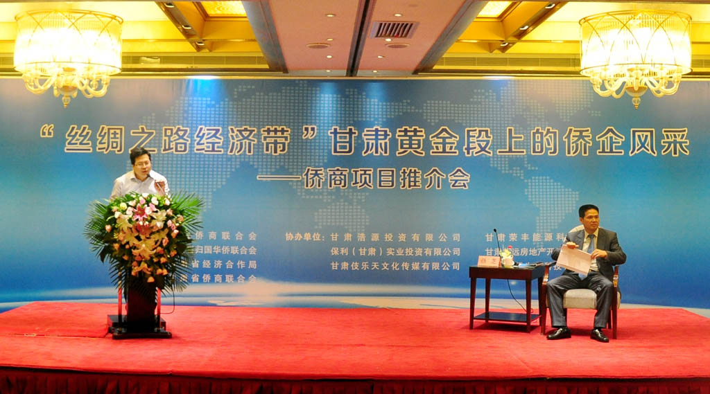 7月7日上午,由中国侨商联合会、甘肃省侨联、甘肃省经济合作局主办,甘肃省侨商联合会承办的“丝绸之路经济带甘肃黄金段”侨企项目推介会在兰州飞天大酒店举行。来自意大利、玻利维亚、秘鲁、荷兰、香港等10多个国家和地区的120余名侨商企业家欢聚一堂,畅叙友谊,共话“一带一路”,增进合作交流。