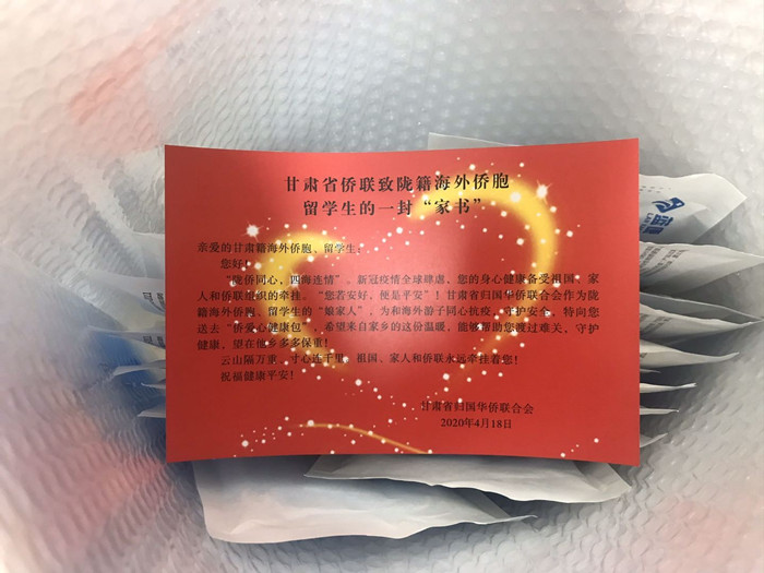 来自美国费城的邵安东说:“近期收到甘肃省侨联的‘侨爱心健康包’,感受到党和祖国在当下全球疫情蔓延的情况下对我们这些远在国外的求学者的支持和关怀,我非常感动。祖国永远是我们海外学子的强大后盾,我会秉承感恩之心,奋发图强,待学成归来之时,为祖国和家乡的现代化建设贡献自己的力量!”