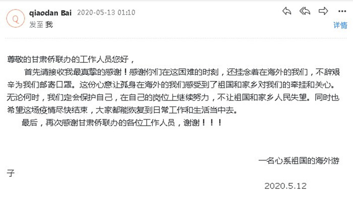 不忘游子,遥寄关怀。近日,一封封饱含着广大陇籍海外侨胞、留学生深情的感谢信让省侨联的官方邮箱 “爆满”。他们在陆续收到甘肃省侨联寄送出的“侨爱心健康包”后,纷纷向省侨联来信、来电,感谢在海外疫情肆虐时“娘家人”对他们的关心关爱。
