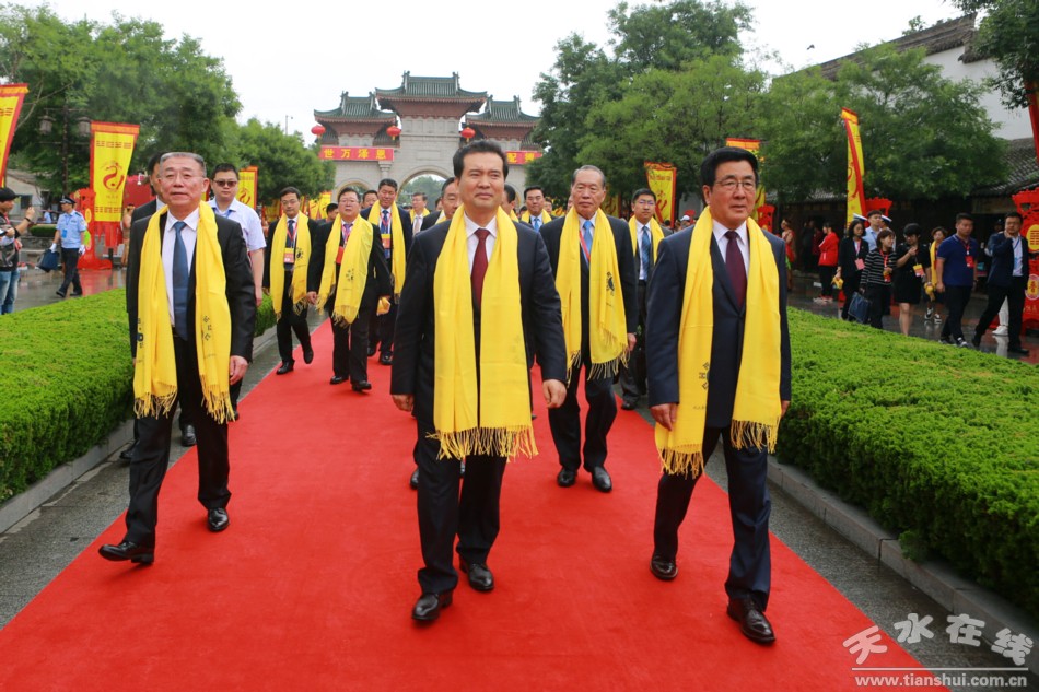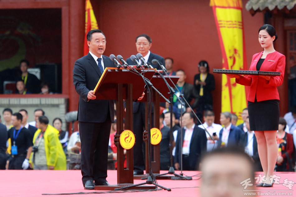 当天上午的伏羲广场上,旗幡招展、古乐悠悠;伏羲庙内,苍松挺拔、翠柏含情。9时30分许,全国政协副主席王正伟,中国国民党前副主席陈镇湘,省委书记、省人大常委会主任林铎,省委副书记、省长唐仁健,省政协主席欧阳坚、中国侨联副主席齐全胜等来到伏羲广场,与海内外中华儿女、四海宾朋共同出席公祭大典。