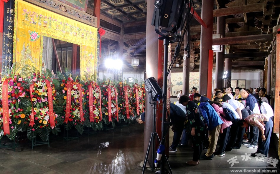 乐舞告祭结束后,王正伟、陈镇湘、林铎、唐仁健、欧阳坚、齐全胜等嘉宾及现场来宾、群众依次进入伏羲庙,向伏羲圣像敬献花篮,拜谒伏羲圣像,感怀伏羲圣德。