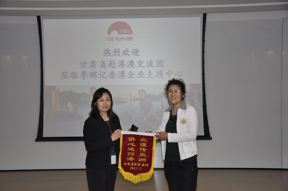 省侨联办公室主任芦小燕代表省侨联向李锦记赠送锦旗