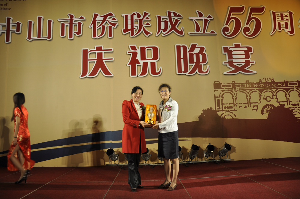 省侨联办公室主任芦小燕代表甘肃省侨联向新当选的中山市侨联主席李嘉颖赠送礼品