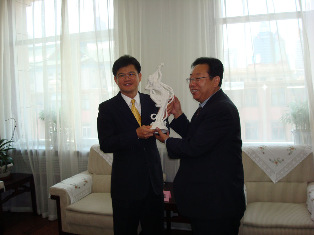 完美(中国)总裁胡瑞连向陆武成书记回赠礼品