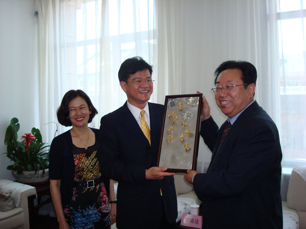 省委常委、兰州市委书记陆武成给完美(中国)总裁胡瑞连夫妇赠送礼品