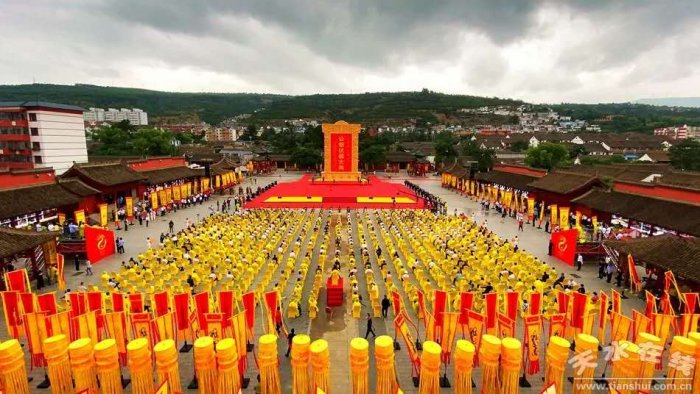 天水伏羲庙广场鼓声雄浑,钟磬悠扬,伏羲庙内古柏参天,旗幡列张。中华儿女聚首羲皇故里天水,怀虔敬之心,以太牢之礼、雅乐之仪,致祭于中华人文始祖太昊伏羲氏。
