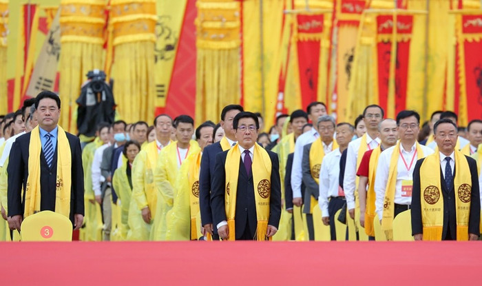 恭读祭文毕,鞠躬敬祭。全体行三鞠躬礼,共同追念人文始祖“一画天开,肇启文明”的功绩,表达对人文始祖的无限追思和尊崇。