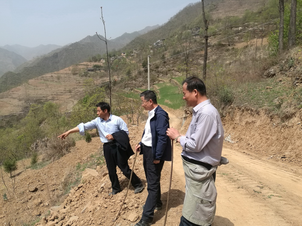 座谈结束后,工作组一行立即在杨家庄村入户走访,逐户了解生产生活情况,精准掌握每户的贫困原因。杨家庄村山大沟深,村民居住分散,从山下至山顶的盘山小路上散住着135户村民,为了详细了解贫困户情况,丁红星书记一行沿着山路步行约10公里,与各处散住的贫困户面对面交流,沿途查看种植的农作物生长情况,村道上路灯架设情况,最后爬至村庄的最高点,实地查看已经建好的蓄水池。