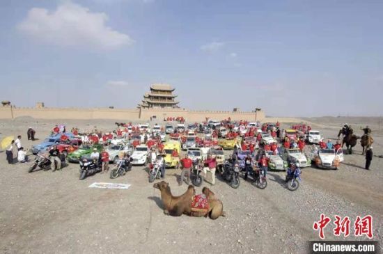 图为姚晓竞带领法国老爷车自驾游团队到达甘肃嘉峪关。(资料图) 受访者供图(图片来源:中新网)