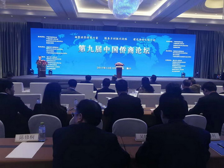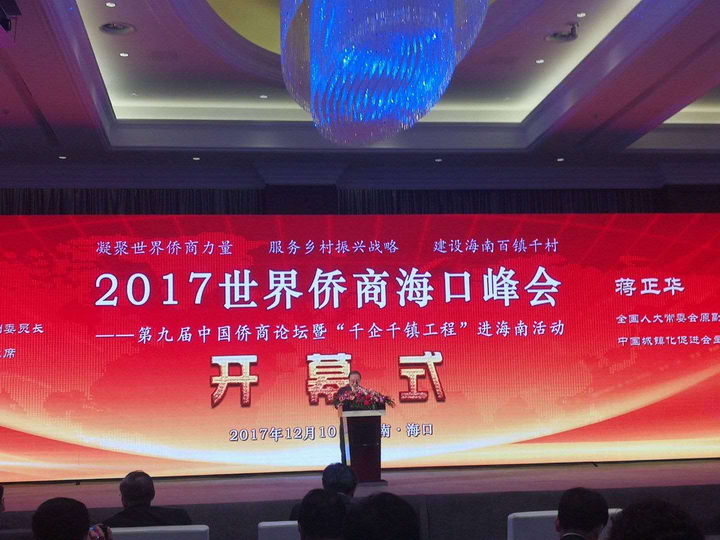 12月9日至12日,由中国侨商联合会、中国城镇化促进会、海南省发展改革委、海南省侨联共同主办的2017世界侨商海口峰会暨中国侨商联合会四届八次理事会在海口举行。全国人大常委会原副委员长、中国城镇化促进会主席蒋正华,全国政协常委、中国侨联副主席李卓彬,海南省人民政府副省长何西庆,全国政协经济委员会副主任、中国侨联副主席、中国侨商联合会会长许荣茂出席会议。