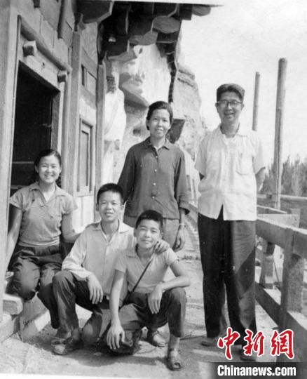 1965年8月常书鸿(右一)一家在敦煌莫高窟合影,前排左二为常嘉煌。(资料图) 受访者供图