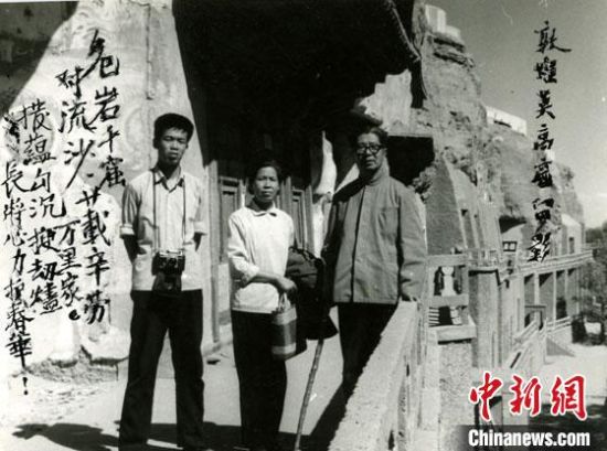 1982年5月,常书鸿(右)、李承仙(中)和常嘉煌(左)在敦煌莫高窟合影。常书鸿在照片上题诗。 受访者供图