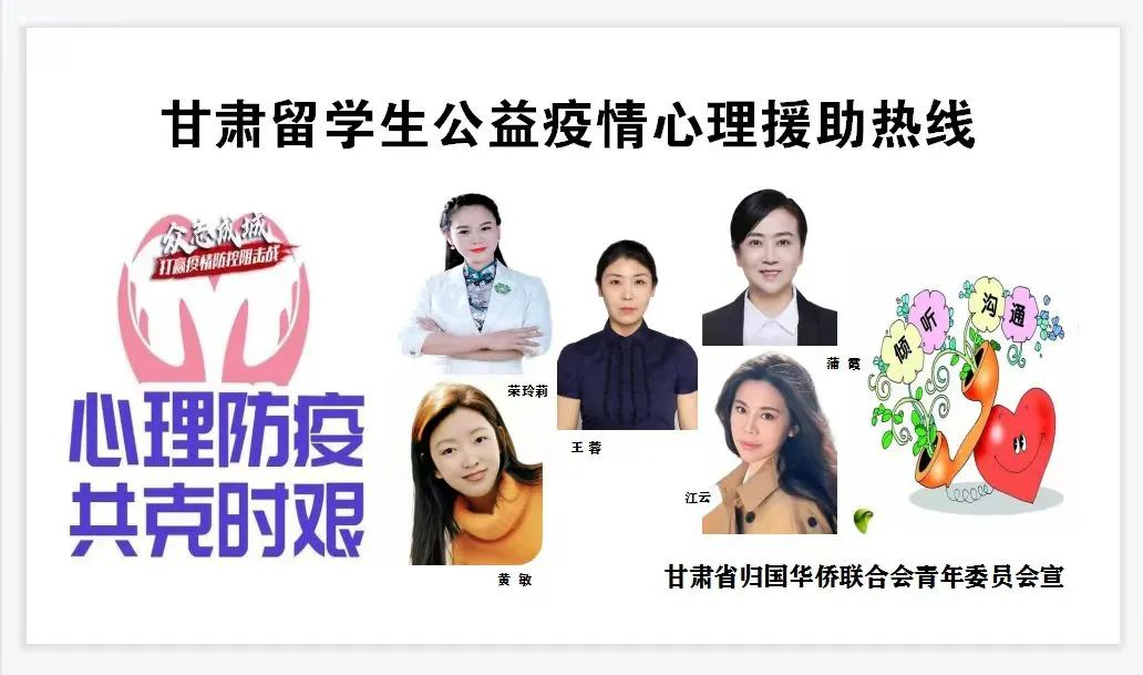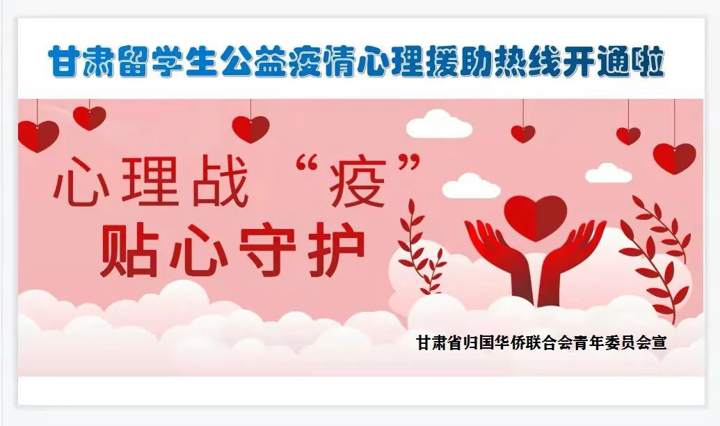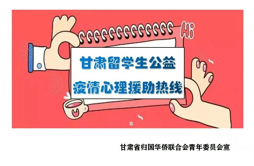 当前,全球新冠疫情防控正处于关键时期,面对疫情,为了更好地帮助身处海外的甘肃学子们度过这一特殊时期,引导留学生们客观理性看待当前疫情形势,做好个人防护和心理建设,针对特殊时期易出现的焦虑、恐慌等心理问题,甘肃省归国华侨联合会青年委员会决定于近期开通“甘肃留学生公益疫情心理援助热线”,为广大甘肃留学生及时提供心理支持,共同打赢疫情防控阻击战。