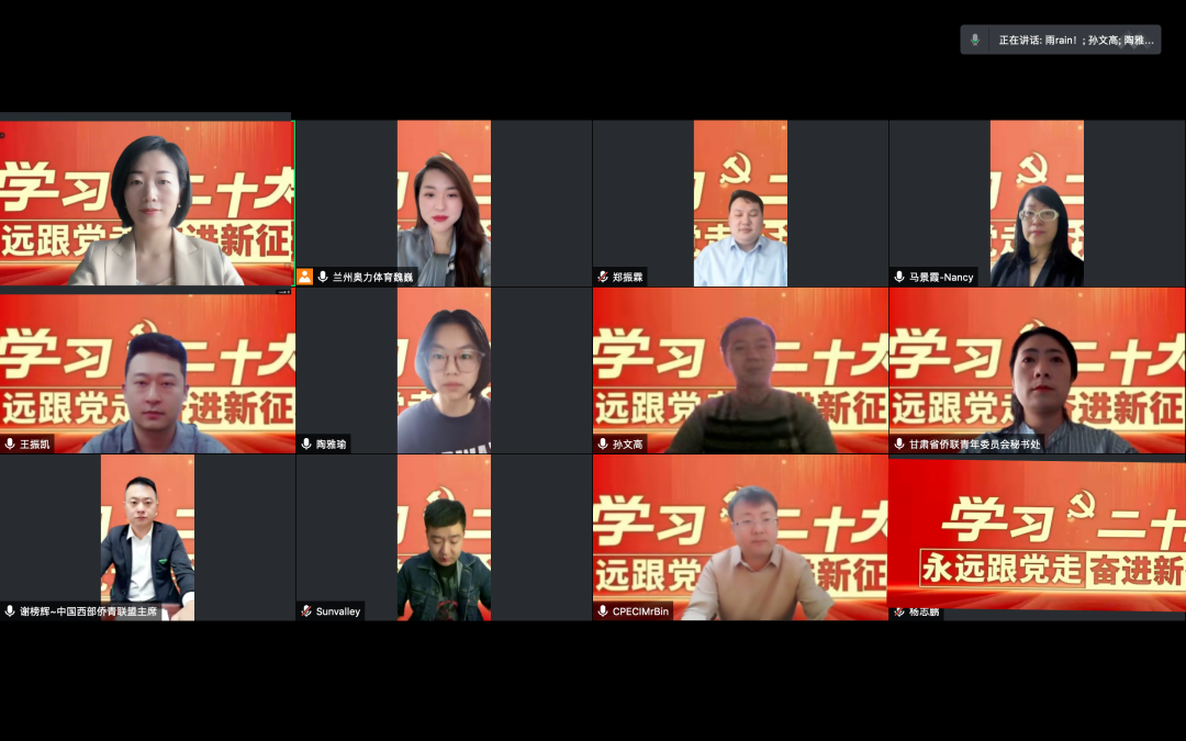 11月17日,甘肃省青年联合会、甘肃省侨联青年委员会“学习二十大·奋进新征程”留学归国青年助力甘肃发展主题座谈会以视频会议的形式召开。甘肃省侨联青年委员会主席、甘肃省青年联合会副秘书长(兼)谢榜辉,甘肃省侨联青年委员会副主席、省侨青委海归分会筹备组组长王振凯及留学归国青年代表十余人参加会议。
