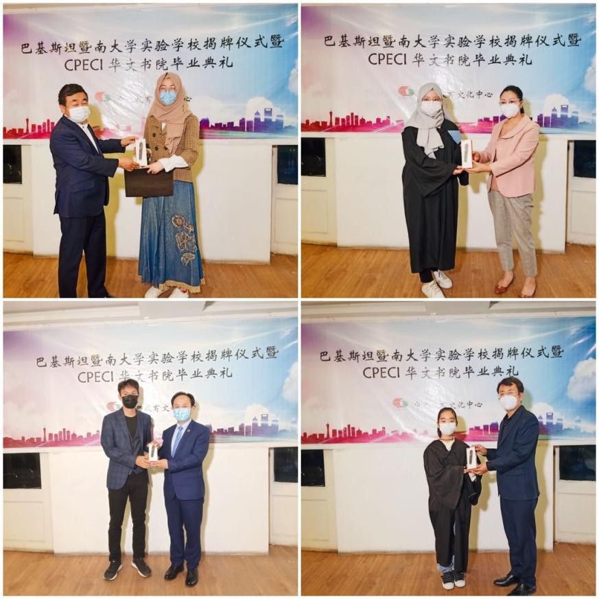 巴基斯坦华侨华人协会会长喇杰廉、巴基斯坦华侨华人妇女协会会长牟秀梅出席活动为优秀毕业生颁发奖品,暨南大学华文学校邵宜院长发了贺信,希望表示携手共同努力促进中巴文化交流,助力一带一路建设。