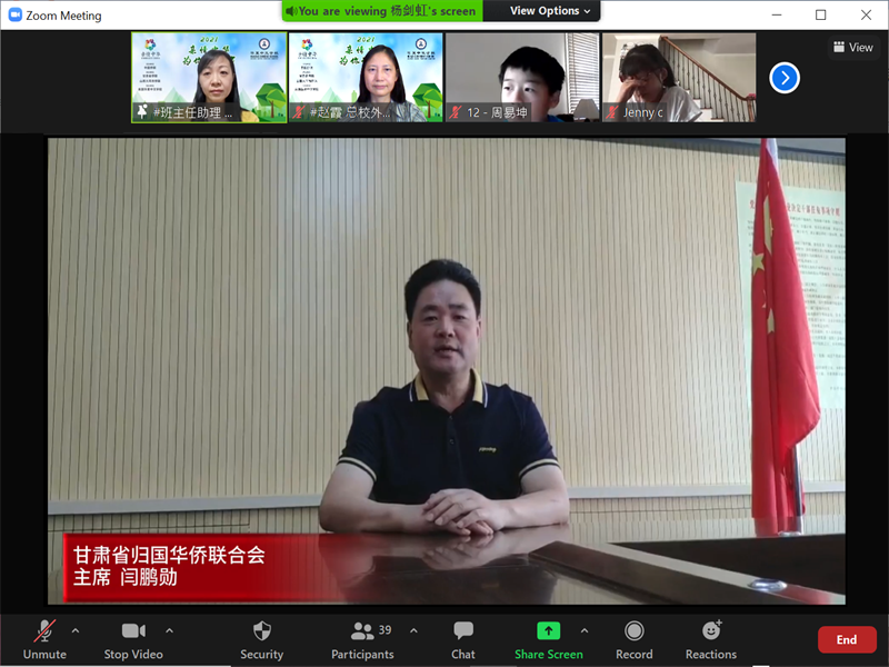 甘肃省侨联主席闫鹏勋在开营仪式上致辞,希望营员们在15天的营期中,通过2个系列30集故事音频和5个甘肃特色视频的学习,能够感悟到博大精深的中华传统文化,感受到千年丝绸之路的绚丽多彩,成为中华文化的爱好者,传承者。