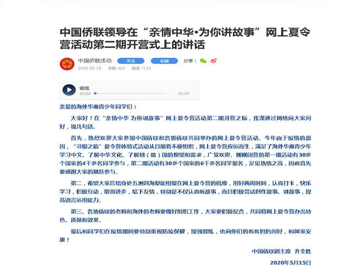 在开营式上,中国侨联副主席齐全胜通过网络向所有营员表示问候。他谈到,热烈欢迎大家参加中国侨联和各级侨联共同举办的网上夏令营活动。今年由于疫情的原因,“寻根之旅”夏令营体验式活动从目前看不便组织,网上夏令营应运而生,满足了海外华裔青少年学习中文、了解中华文化、了解祖(籍)国的愿望和需求,广受欢迎。刚刚闭营的第一期活动有30多个国家的4000多名同学参与,第二期活动有30多个国家的6000多名同学报名,足见热情之高,因此首先要感谢大家的踊跃参与。希望大家珍惜身处五洲四海却能相聚在网上夏令营的机缘,用好两周时间,认真打卡,快乐学习,积极互动,取得进步,结下友情,特别是不仅认真听故事,而且积极尝试创作故事、讲故事,提高语言运用能力。