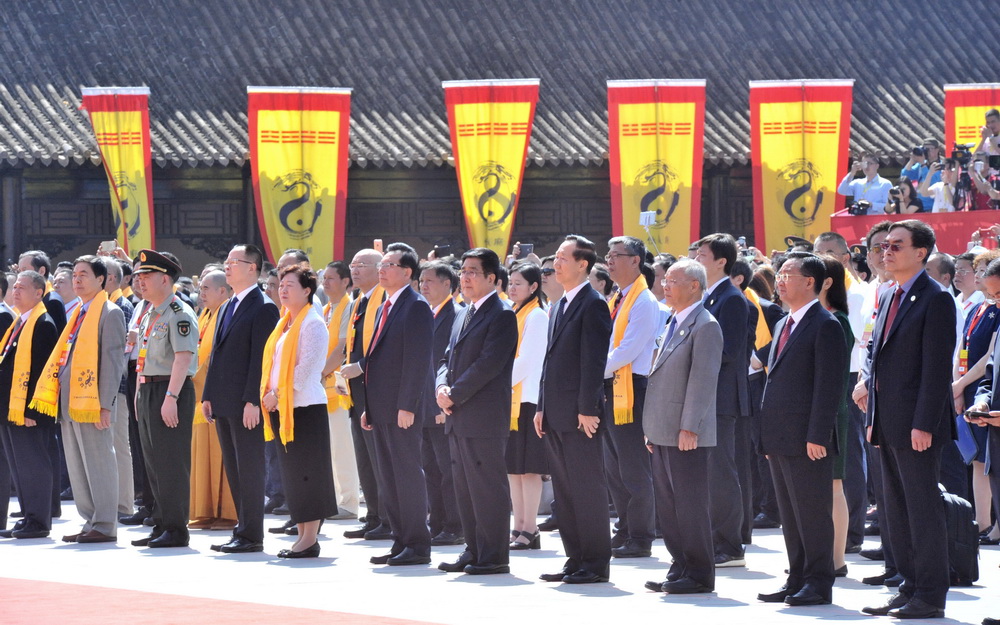 祭乐奏起,全场肃立,击响的34通鼓声象征着全国31个省区市和香港特别行政区、澳门特别行政区及台湾地区共祭中华人文始祖的崇敬之情,9响钟鸣代表了中华民族传统的最高礼数。此刻,大家肃穆伫立,共同追念人文始祖伏羲的伟大功绩,表达全体中华儿女对人文始祖的无限尊崇。